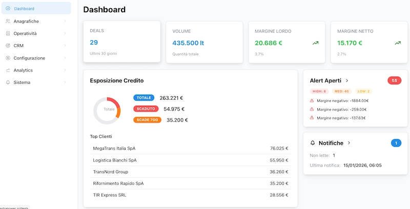 Un unico cruscotto che trasforma dati caotici in decisioni vincenti. Ogni litro tracciato. Ogni centesimo contato. Ogni margine massimizzato.